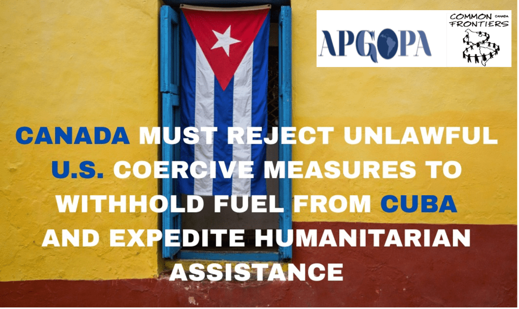The Americas Policy Group (APG) and Common Frontiers, coalitions formed by dozens of respected Canadian civil society organizations, are deeply concerned about the human rights impacts of a U.S. executive order imposing a fuel blockade on Cuba. We call on Canada to immediately reject this dangerous, coercive action which is incompatible with principles of sovereignty, non-intervention and self-determination, essential for a democratic, equitable and peaceful international order.