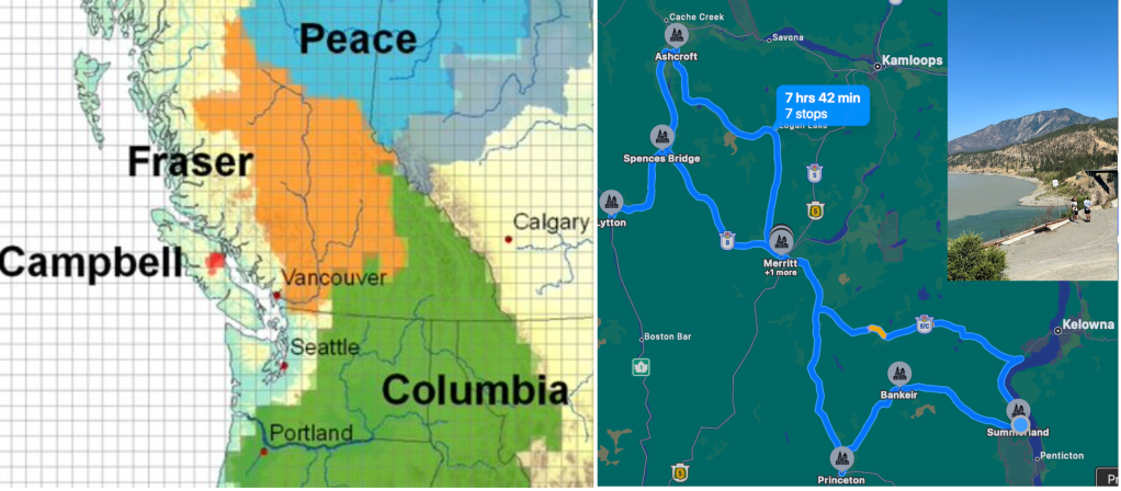 We drove west from Summerland on a beautiful mountain route that follows an ancient Indigenous trail—later part of the Kettle Valley Railroad and now a bike path—to just north of Princeton. Then we turned north to Merritt. From there, we followed the Nicola River northwest on Highway 8.