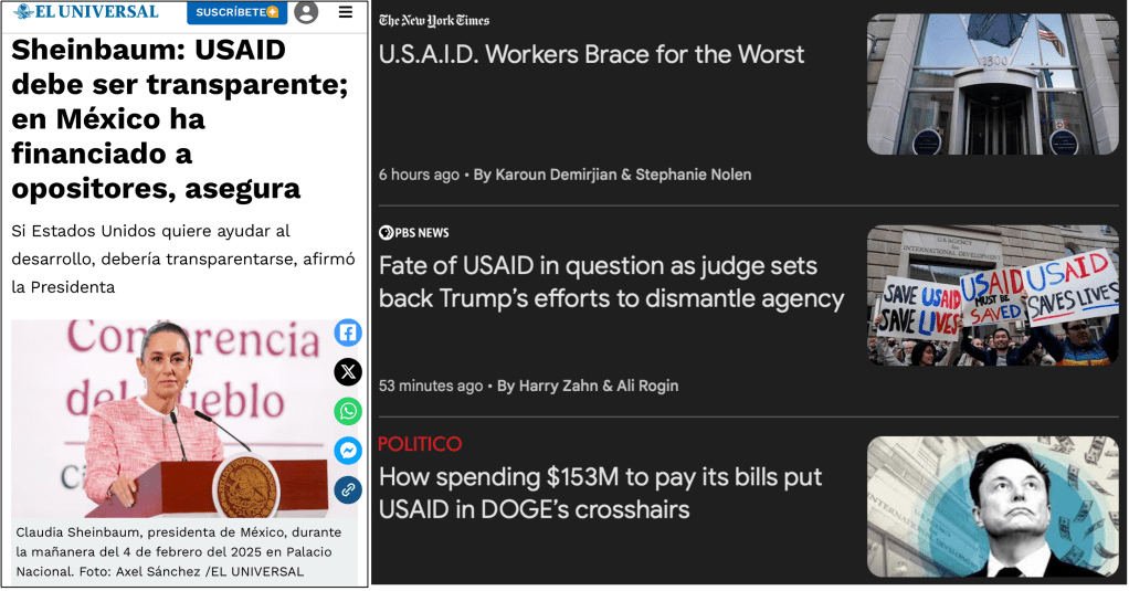 Sheinbaum (left): USAID must be transparent; in Mexico, it has funded the opposition. Right: USAID still in the headlines Feb. 8.