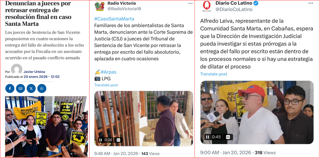 When the second trial concluded in September 2025, the San Vicente Sentencing Court reached the same conclusion in its oral ruling, acquitting the defendants of criminal charges. But the court has since delayed delivering its final written ruling four times, unjustifiably prolonging the judicial process and leaving the case without definitive closure.