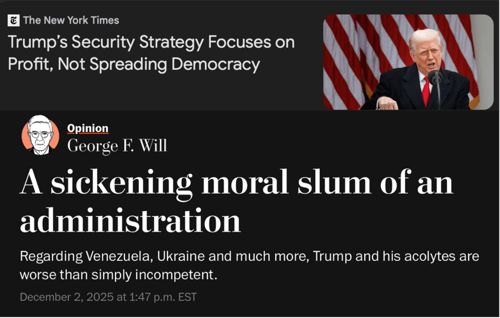 I take my title today from the headline over La Jornada’s lead editorial Sunday, Dec. 7: Monroe nunca se fue. Trump’s policy (“Donroe”) rejects the polite notion of a “good neighbour policy” towards Latin America and the Caribbean promoted after 1933 by Franklin D. Roosevelt and others. But that approach was betrayed repeatedly by presidents from both parties who involved themselves in coups in Guatemala, Brazil, Chile, Honduras and elsewhere, along with invasions of the Dominican Republic, Haiti, Grenada and Panama – and the wars in Central America in the 1980s and U.S. support for paramilitary death squads in Colombia.