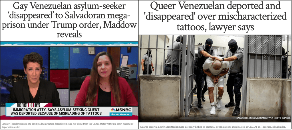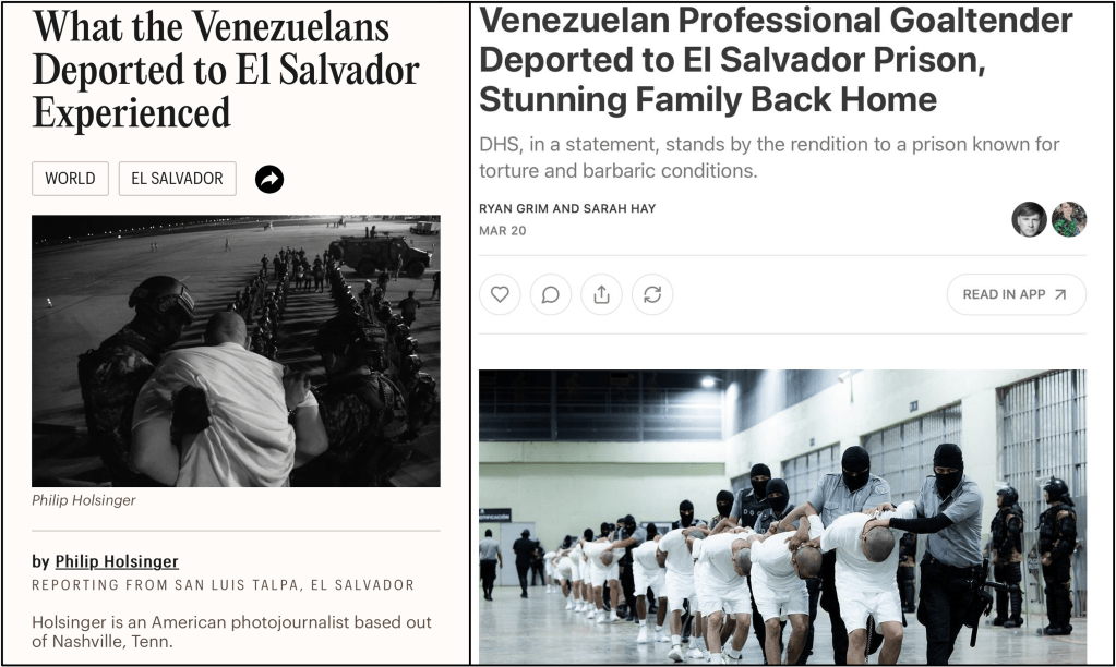 Drop Site News reported that another deportee was a Venezuelan professional soccer player and youth soccer coach with no criminal record. “The family only discovered that their loved one, Jerce Reyes Barrios, had been sent to El Salvador when they saw him in viral videos posted by the Trump administration, in which it celebrated what it said was the mass deportation of violent members of the Venezuelan gang Tren de Aragua.”