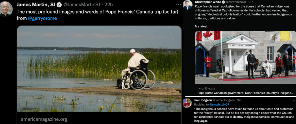 Pope Francis should also have addressed the “Doctrine of Discovery.” Thomas Reese, a Jesuit priest who works with the Religion News Service, wrote after the visit that the pope’s remarks in a news conference during the flight back to Rome revealed that he had not been properly briefed for the visit. Francis said he had not thought to use the term “genocide” to describe the effects of the Indian residential schools system, but agreed that it was “true.”